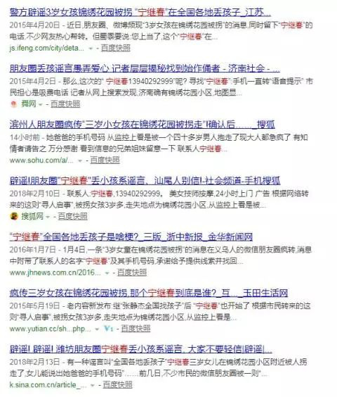 在網(wǎng)上搜索"寧繼春",就會(huì)發(fā)現(xiàn)這其實(shí)是一則不折不扣的假消息。從2014年起,全國(guó)各地就傳出錦繡花園小區(qū)"丟孩子"的網(wǎng)絡(luò)謠言,還有10萬(wàn)元"重謝"的承諾。