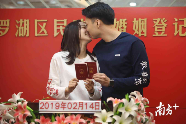 我們結(jié)婚啦!2月14日情人節(jié),一大早,深圳市羅湖區(qū)民政局婚姻登記處迎來許多對新人前來登記結(jié)婚。頒發(fā)證件、許下諾言、親密相吻……一對接一對的新人完成莊重的儀式,留下甜蜜蜜的合影,浪漫的氣息彌漫整個空間。南方日報記者朱洪波攝影報道
