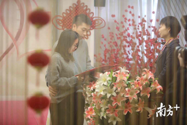 我們結(jié)婚啦!2月14日情人節(jié),一大早,深圳市羅湖區(qū)民政局婚姻登記處迎來許多對(duì)新人前來登記結(jié)婚。頒發(fā)證件、許下諾言、親密相吻……一對(duì)接一對(duì)的新人完成莊重的儀式,留下甜蜜蜜的合影,浪漫的氣息彌漫整個(gè)空間。南方日?qǐng)?bào)記者朱洪波攝影報(bào)道