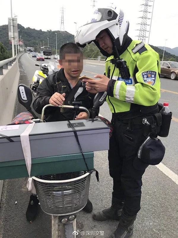 2月14日上午,深圳交警巡邏至南坪快速長(zhǎng)嶺陂大橋時(shí)發(fā)現(xiàn)一輛非機(jī)動(dòng)車上快速路。上前詢問后得知,男子是幫客戶送禮物的,不料卻迷路了,這才誤闖了快速路。蜀黍?qū)ζ浣逃螅杆賹?dāng)事人護(hù)送下快速路路口。