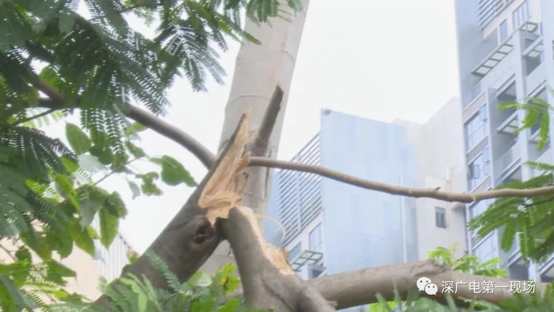 園林養(yǎng)護(hù)公司相關(guān)負(fù)責(zé)人介紹,這棵樹的樹名叫做南洋楹,記者觀察發(fā)現(xiàn),該路段種植的樹木基本都屬于這一樹種,但唯獨(dú)這一棵出現(xiàn)了樹枝折斷的情況。記者還在旁邊發(fā)現(xiàn)了一棵同樣的樹,樹干已經(jīng)被折斷,劉先生說,這還是去年9月份,被臺(tái)風(fēng)山竹吹斷的。像今天這種風(fēng)平浪靜的情況下斷枝,非常少見。