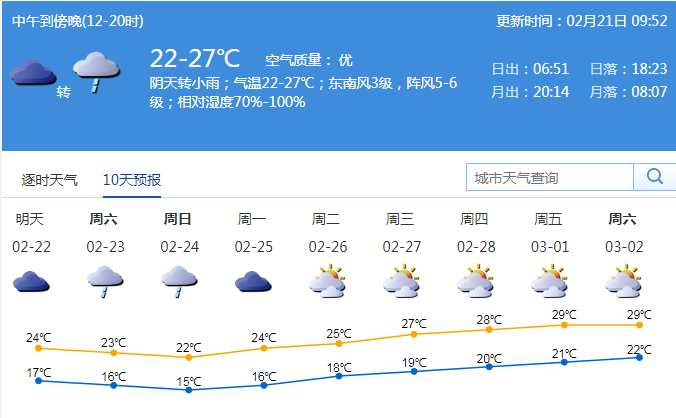 記者從深圳市氣象局了解到,21日深圳市以多云轉陰天為主,有分散小雨;氣溫在21-27℃;東南風2-3級;相對濕度65%-95%。