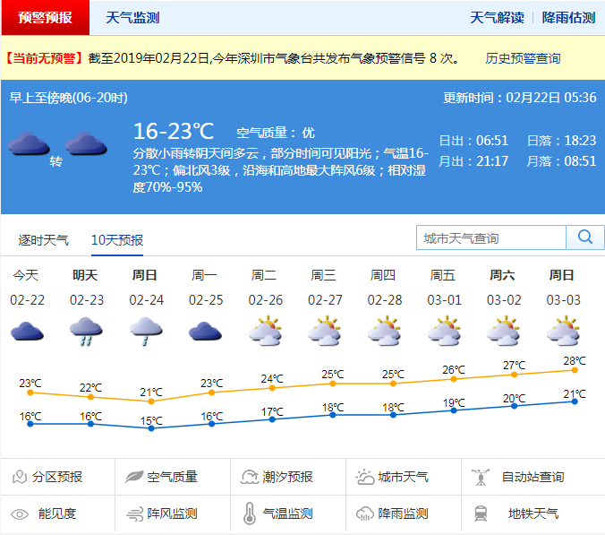 深圳新聞網(wǎng)2019年2月22日訊 最近兩天深圳氣溫回升,宛若初夏。今日,全市陰天為主,局部偶有零星小雨,氣溫明顯下降,最低氣溫16℃,提醒市民注意保暖。