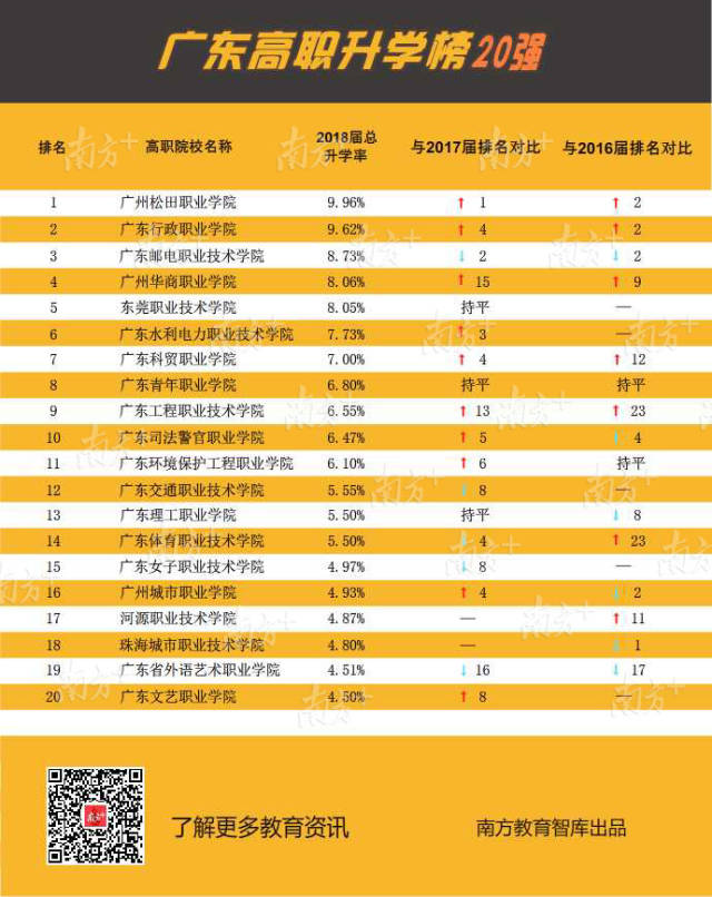 近3年各高職升學(xué)數(shù)據(jù)顯示,越來(lái)越多畢業(yè)生通過(guò)升學(xué)提升自身競(jìng)爭(zhēng)力,尤其2018屆升學(xué)率增長(zhǎng)明顯。其中有7所高職院校的畢業(yè)生升學(xué)率達(dá)到或超過(guò)7%,分別是廣州松田職業(yè)學(xué)院9.96%、廣東行政職業(yè)學(xué)院9.62%、廣東郵電職業(yè)技術(shù)學(xué)院8.73%、廣州華商職業(yè)學(xué)院8.06%、東莞職業(yè)技術(shù)學(xué)院8.05%、廣東水利電力職業(yè)技術(shù)學(xué)院7.73%和廣東科貿(mào)職業(yè)學(xué)院7.00%。
