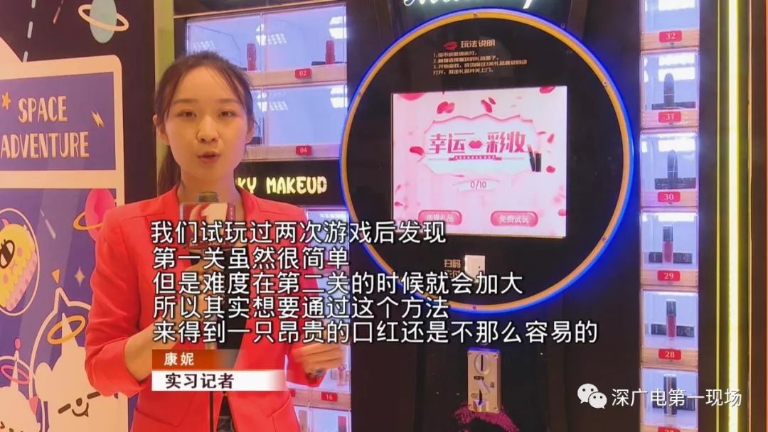 在福田區(qū)的一家商場(chǎng)的醒目位置,擺放著幾臺(tái)口紅機(jī),機(jī)器上有幾十個(gè)透明的小格子,里面都擺放著大牌口紅。但想要得到口紅,就得先玩游戲,游戲一共有三關(guān)。依托于一個(gè)糖果轉(zhuǎn)盤,每關(guān)糖果旋轉(zhuǎn)的速度都會(huì)提高一些,只有全部通關(guān)之后,才能拿到心儀的口紅。