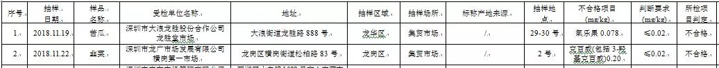 此次監(jiān)測蔬菜63品份,其中2份樣品農(nóng)殘超標(biāo),不合格樣品抽樣位點(diǎn)是:龍華區(qū)大浪街道龍勝路888號(hào)龍勝堂市場29-30號(hào)檔和龍崗區(qū)橫崗街道橫崗第一市場2號(hào)檔。