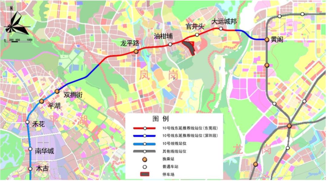 10號(hào)線東延是聯(lián)系平湖、東莞鳳崗及大運(yùn)新城的普速線路,主要功能為加強(qiáng)龍崗中心城與平湖、坂雪崗的聯(lián)系、促進(jìn)深莞一體化。東延線路由在建地鐵10號(hào)線雙擁街站后引出,出站后轉(zhuǎn)向東北方向,下穿鳳凰山國家礦山公園,之后進(jìn)入東莞,東莞段內(nèi)沿龍平路敷設(shè),在東北師大益田小學(xué)北側(cè)向東南下穿武深高速、鹽龍大道進(jìn)入清林路,接至在建16號(hào)線黃閣站。線路全長約9.8km,設(shè)站5座,采用地下敷設(shè)方式。