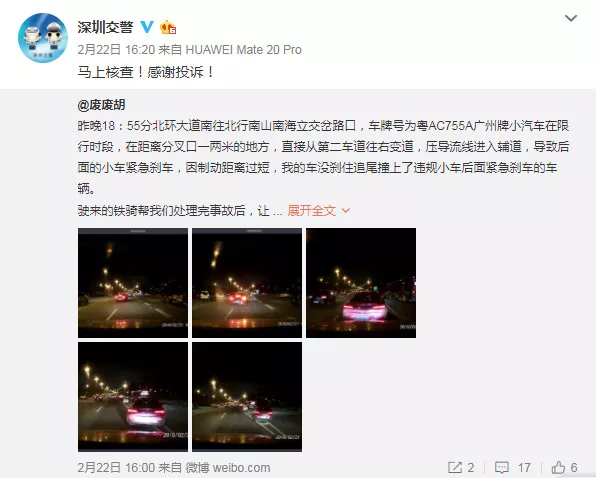 深圳新聞網(wǎng)2019年2月26日訊(記者 劉婷)據(jù)深圳交警權(quán)威發(fā)布消息,2019年2月22日下午16時(shí)22分,深圳交警收到微博網(wǎng)友舉報(bào)稱:2月21日18時(shí)55分,在北環(huán)大道南海立交路段,一輛廣州牌照小車在深圳限行時(shí)段,連續(xù)變道并壓導(dǎo)流線進(jìn)入輔道,導(dǎo)致后面兩車發(fā)生追尾事故。深圳交警立即對舉報(bào)信息進(jìn)行分析、經(jīng)過后臺系統(tǒng)查詢,與被舉報(bào)廣州車牌小車車主取得聯(lián)系,但車主稱不是其本人開車,而且人和車都在廣州,不方便來深圳處理。