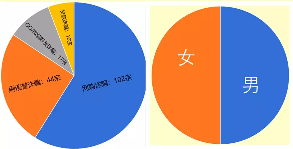 其中,以網(wǎng)購(gòu)和刷單詐騙占比最大,受害學(xué)生男女比例基本持平。