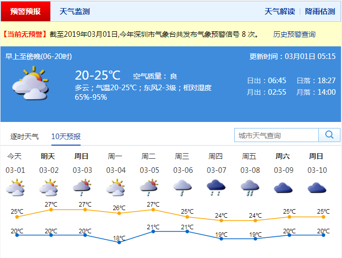 深圳新聞網(wǎng)2019年3月1日訊(記者陳婕)今天的陽光似乎溫暖過了頭,太陽的出現(xiàn),緩解了潮濕的情況,未來兩天深圳繼續(xù)溫暖濕潤,早晚能見度較低,周末兩天多云,部分時間可見陽光。而從3月3日開始,深圳將連續(xù)有雨。