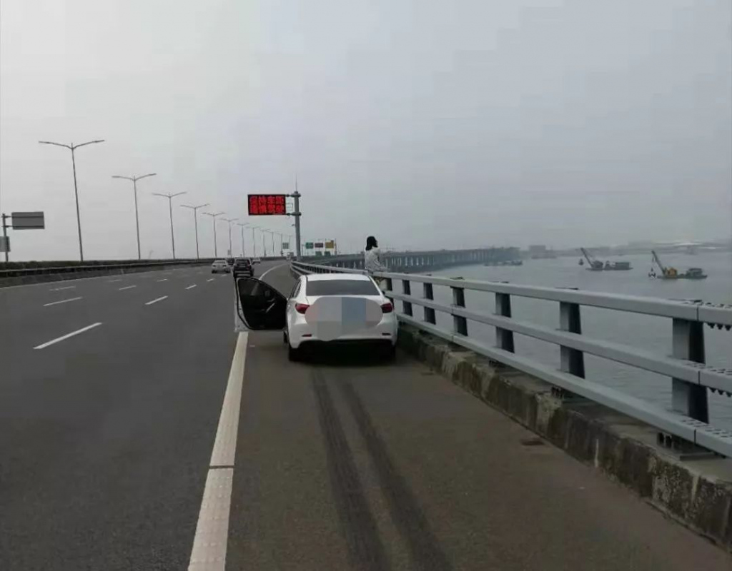 2019年3月4日14時(shí)許,深圳交警接到報(bào)警稱在沿江高速北行西鄉(xiāng)段,一輛白色小轎車停在應(yīng)急車道,小轎車旁一名女子坐在高速公路橋邊情緒十分不穩(wěn)定。深圳交警快速反應(yīng),立即趕往現(xiàn)場。