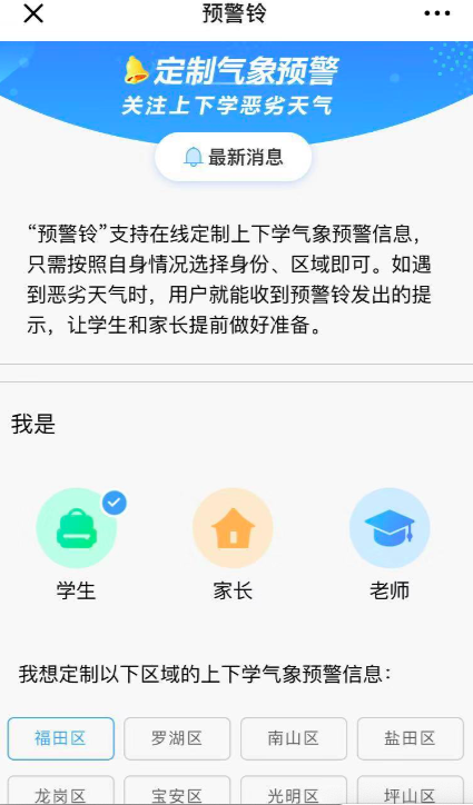 開學(xué)首日,深圳市氣象局就聯(lián)合深圳市教育局推出上下學(xué)時(shí)段高級(jí)別臺(tái)風(fēng)暴雨預(yù)警提示服務(wù)——“預(yù)警鈴”,廣大學(xué)生和家長可以通過關(guān)注“深圳天氣”微信公眾號(hào)進(jìn)入“市民互動(dòng)→預(yù)警鈴”頁面定制上下學(xué)預(yù)警信息,及時(shí)掌握自己所在區(qū)域的天氣狀況,合理安排出行,保障學(xué)生安全。
