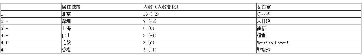 值得注意的是,上榜的女富豪居住城市中,前五名城市均來自中國(guó),北京以13位上榜女富豪數(shù)位列第一。深圳、上海緊隨其后,各有9位、6位上榜女富豪居住,分別位列第二、第三。