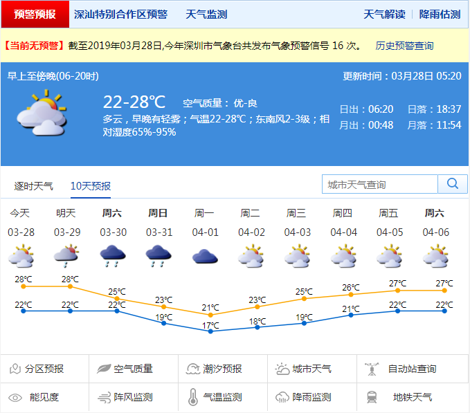 深圳新聞網2019年3月28日訊 深圳今日多云,早晚有輕霧或霧;20-27℃;南風2-3級;濕度60%-95%。預計29日多云轉陣雨;30-31日冷空氣影響,陰天有陣雨或雷陣雨,天氣轉涼;4月1日陰轉多云,偶有零星小雨;2日起氣溫逐日回升。