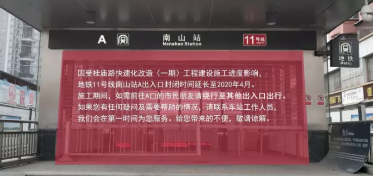 乘客們也請(qǐng)注意:11號(hào)線(xiàn)南山站A出入口延長(zhǎng)封閉時(shí)間至2020年4月