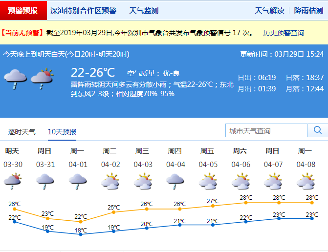 深圳新聞網(wǎng)2019年3月29日訊 記者從深圳氣象局了解到,昨天夜間到今天白天,我市多云,夜間到早晨有輕霧,局地大霧;早晨最低氣溫22-23℃,白天最高氣溫27-28℃;相對(duì)濕度70%-100%;南風(fēng)2-3級(jí);昨天夜間能見度1-5公里。東部局地有大霧能見度在1公里以下,白天能見度轉(zhuǎn)好達(dá)到10-20公里。