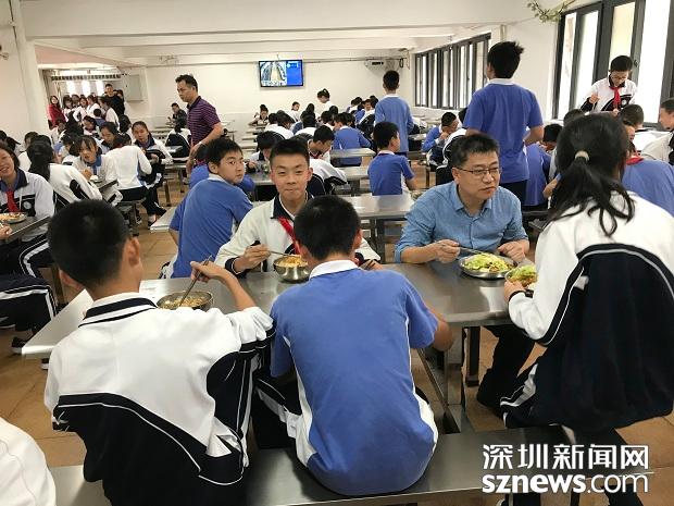 4月1日中午,深圳市福田區(qū)外國(guó)語學(xué)校校長(zhǎng)丁長(zhǎng)義跟學(xué)生一起在食堂就餐