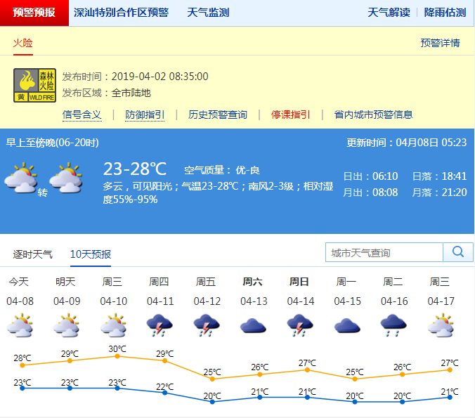 深圳新聞網2019年4月8日訊 深圳市氣象臺預計,本周前期我市無降雨,后期將轉多陣雨天氣。具體來說:8日多云可見陽光,氣溫23-28℃,南風2-3級,濕度55%-90%;9-10日多云為主,早晚有輕霧或霧;11日多云間陰天,傍晚或夜間轉雷陣雨;12日陰天有陣雨或雷陣雨,沿海和高地陣風6-7級,氣溫下降;13日陰天間多云,偶有小雨。