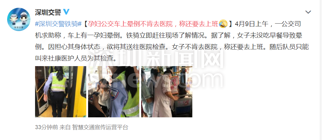 深圳新聞網(wǎng)2019年4月9日訊(記者 施冰冰)記者從“深圳交警”處了解到,4月9日上午,有公交司機求助稱,車上有一孕婦暈倒。鐵騎立即趕往現(xiàn)場了解情況。據(jù)了解,女子未沒吃早餐導致暈倒。因擔心其身體狀態(tài),欲將其送往醫(yī)院檢查。女子不肯去醫(yī)院,稱還要去上班。隨后隊員只能叫來社康醫(yī)護人員為其檢查。