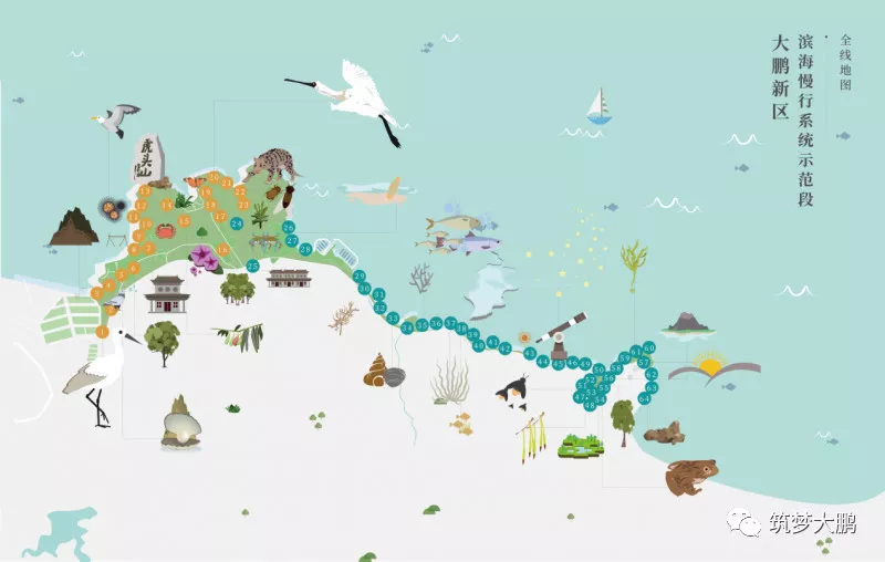 大鵬新區(qū)根據(jù)線路的地形、山海景觀、人文景觀的分布,確定了“打造‘兩線、三段、五大節(jié)點(diǎn)’的濱海生態(tài)自然課堂步道”。據(jù)新區(qū)建筑工務(wù)局負(fù)責(zé)人介紹,從新大河入??诘酱髞啚澈0堵咕讘已拢L18.7公里的海岸線上分布著河流、山林、海灘、溪流、濕地等多樣生態(tài)系統(tǒng)。2017年7月,大鵬新區(qū)按照濱海慢行系統(tǒng)示范工程標(biāo)準(zhǔn),動(dòng)工建設(shè)新大-鹿嘴市政綠道。“兩線”指的是沿著海岸的濱海徒步路線和城市二號(hào)綠道線,兩條線之間的6.6平方公里土地將形成一座開放的郊野公園;“三段”分別為活力生活段、自然生態(tài)段和休閑旅游段;“五大節(jié)點(diǎn)”為山海綠畔、古廟遺風(fēng)、東山凹、愛情灘、鹿咀山莊等自然景觀。