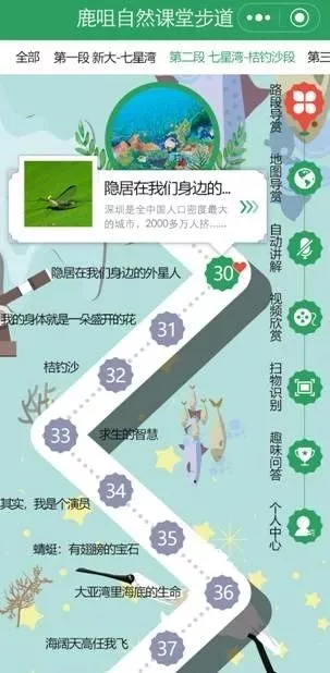 隨著綠道行進(jìn)的深入,記者來(lái)到第一個(gè)自然觀察研習(xí)點(diǎn),這里配置有自然研習(xí)導(dǎo)賞標(biāo)識(shí)牌,牌上有植物動(dòng)物的照片及介紹,牌子的角落有供游客學(xué)習(xí)的二維碼。記者了解到,新區(qū)同時(shí)開(kāi)發(fā)建立一套APP自然課堂學(xué)習(xí)系統(tǒng),在綠道全程配套建設(shè)64個(gè)實(shí)地自然觀察研習(xí)點(diǎn),設(shè)置了260余個(gè)自然研習(xí)導(dǎo)賞標(biāo)識(shí),接入專業(yè)智能識(shí)別軟件,配以體量龐大生物影像數(shù)據(jù)庫(kù)。掃碼進(jìn)入APP就可以通過(guò)文字、圖片和音像資料了解到“大鹿線”全景介紹和分區(qū)介紹,以及物種相關(guān)知識(shí)。同時(shí),該系統(tǒng)利用手機(jī)GPS定位技術(shù),為行進(jìn)中的市民游客自動(dòng)講解所到之處的自然課堂語(yǔ)音課程。來(lái)自羅湖的資深驢友李先生告訴記者,來(lái)“大鹿線”徒步,不僅鍛煉身體愉悅心情,還可以學(xué)到豐富的自然知識(shí),打開(kāi)APP行走全程,猶如參觀了一座多維一體的山?!叭安┪镳^”。