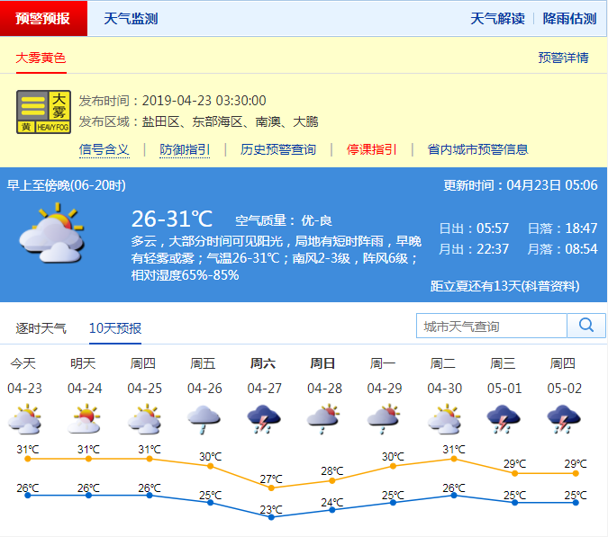 深圳新聞網(wǎng)2019年4月23日訊 深圳市氣象局預(yù)計(jì)23日多云,大部分時(shí)間可見(jiàn)陽(yáng)光,中午前后天氣悶熱,局地有短時(shí)陣雨,早晚有輕霧或霧;25-31℃;輕微南風(fēng);濕度65%-85%。24-25日多云局地有短時(shí)陣雨,中午較熱;26日起天氣趨于不穩(wěn)定。