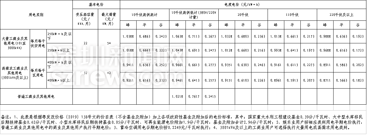 深圳市工商業(yè)電價價目表(從2019年4月1日起執(zhí)行)