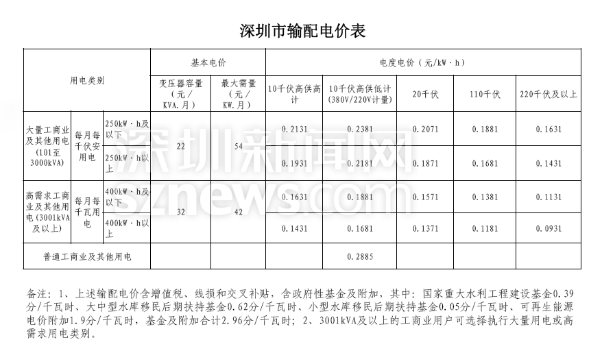 深圳市輸配電價價目表(從2019年4月1日起執(zhí)行)