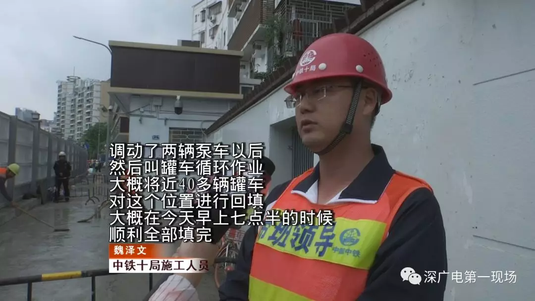 路面坍塌情況發(fā)生后,該路段也第一時間被封閉,由附近的桂廟路快速化改造工程二標施工方中鐵十局進行應急處置,往塌陷位置灌注混凝土。