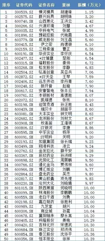 薪酬排行榜倒數(shù)前50