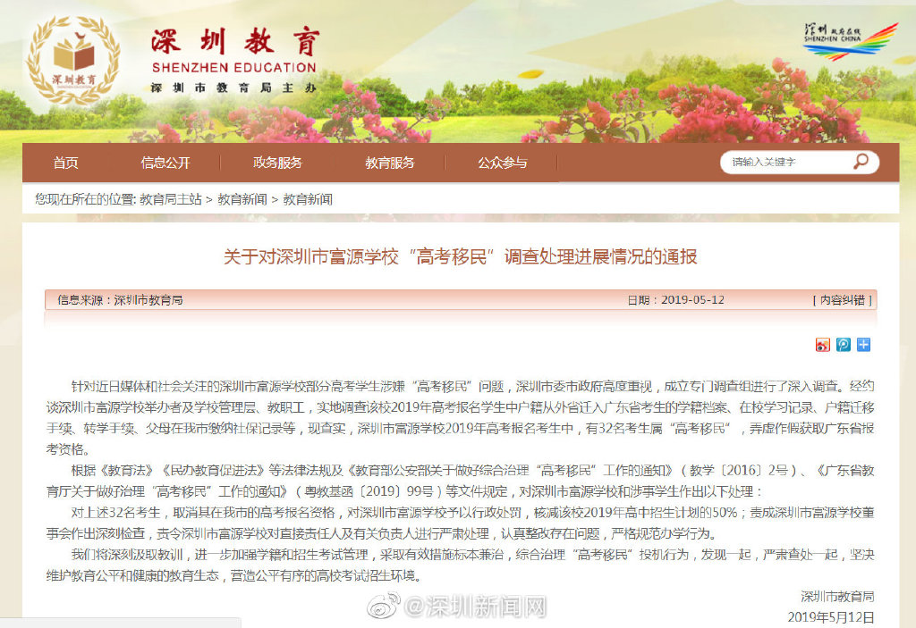 針對近日媒體和社會關(guān)注的深圳市富源學(xué)校部分高考學(xué)生涉嫌“高考移民”問題,深圳市委市政府高度重視,成立專門調(diào)查組進(jìn)行了深入調(diào)查。經(jīng)約談深圳市富源學(xué)校舉辦者及學(xué)校管理層、教職工,實(shí)地調(diào)查該校2019年高考報名學(xué)生中戶籍從外省遷入廣東省考生的學(xué)籍檔案、在校學(xué)習(xí)記錄、戶籍遷移手續(xù)、轉(zhuǎn)學(xué)手續(xù)、父母在我市繳納社保記錄等,現(xiàn)查實(shí),深圳市富源學(xué)校2019年高考報名考生中,有32名考生屬“高考移民”,弄虛作假獲取廣東省報考資格。