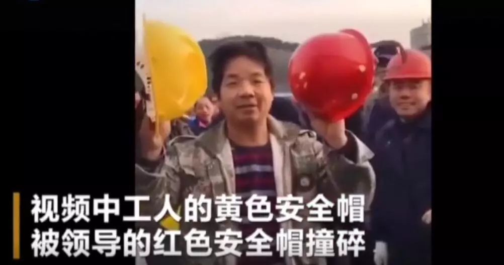 ▲視頻里,一位工人將手中兩種不一樣的安全帽對(duì)撞。其中,工人佩戴的黃色安全帽破裂,而“領(lǐng)導(dǎo)佩戴”的紅色安全帽完好無(wú)損。
