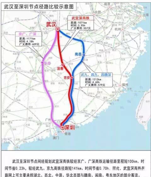 據(jù)了解,為了分流日益飽和的京廣高鐵客流,湖北提出擬在武漢和深圳之間建設(shè)一條高鐵。武深高鐵大致走向?yàn)椋何錆h -咸寧 -修水 -銅鼓 -宜豐 -萬載 -宜春 -安福 -井岡山 -遂川 -贛州 -深圳。一旦建成,將形成武漢到深圳的一條筆直線路。初步預(yù)測分析,新規(guī)劃的武漢至深圳高速鐵路,較經(jīng)京廣、廣深高鐵運(yùn)輸徑路里程短100多公里,時(shí)間節(jié)省20分鐘;較經(jīng)武九、京九高鐵徑路短141公里,時(shí)間節(jié)省42分鐘。