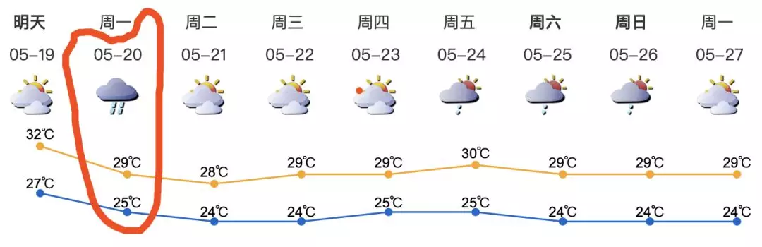 19日多云,局地有短時陣雨或雷雨,天氣悶熱;20日有一次明顯降雨過程,局部地區(qū)有暴雨,伴有雷暴大風(fēng)。21日起轉(zhuǎn)多云,氣溫略降↓,悶熱天氣緩解。