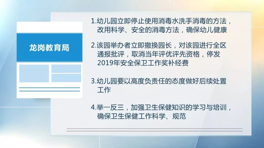 5月24日,龍崗區(qū)教育局了解到該情況后,立即派工作人員到幼兒園進(jìn)行調(diào)查。經(jīng)查,該園出現(xiàn)“皰疹性咽頰炎”后,違規(guī)使用強力消毒粉兌水給幼兒洗手消毒,存在衛(wèi)生保健上嚴(yán)重錯誤。