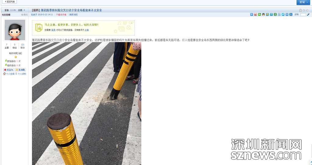 深圳新聞網(wǎng)2019年5月29日訊(記者 劉婷)“蓮花路景田東路交叉口這個(gè)安全島看起來不太安全?!苯?,網(wǎng)友“專打蒼蠅”在深圳論壇爆料稱,蓮花路景田東路交叉口安全島警示樁受損,存在安全隱患。5月29日,記者來到該路段實(shí)地勘察,發(fā)現(xiàn)安全島受損警示樁已全部整改。 (原帖文:蓮花路景田東路交叉口這個(gè)安全島看起來不太安全)