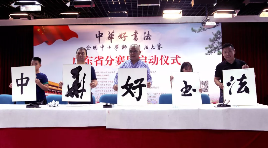 “中華好書法”全國中小學師生書法大賽廣東賽區(qū)組委會執(zhí)行副主任趙永金和教師代表趙軍、崔占海,學生代表劉子文、李唐心上臺為“中華好書法”全國中小學師生書法大賽廣東賽區(qū)比賽開筆,在四尺斗方宣紙上寫下了“中華好書法”五個大字,由此拉開了“中華好書法”全國中小學師生書法大賽廣東省分賽區(qū)大賽的序幕。