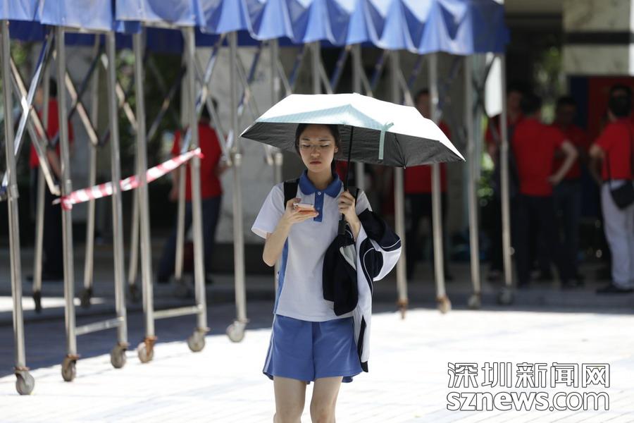 高考語文科目考試結(jié)束,一名考生撐著遮陽傘淡定走出考場(chǎng)
