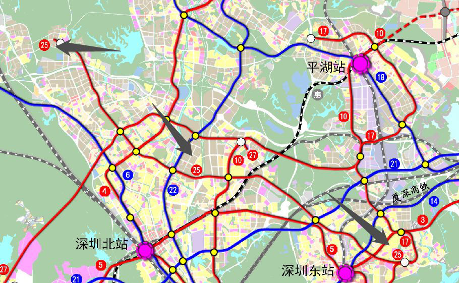 根據(jù)《深圳市城市軌道線網(wǎng)規(guī)劃(2016-2030)》,25號線定位為支撐深圳市北部發(fā)展帶的普速服務線。線路聯(lián)系龍華、坂田、布吉等橫向二圈層片區(qū),增加沿線片區(qū)的軌道覆蓋率,加強橫向聯(lián)系,同時與5條縱向軌道快、干線換乘,喂給客流,完善軌道線網(wǎng)結(jié)構。