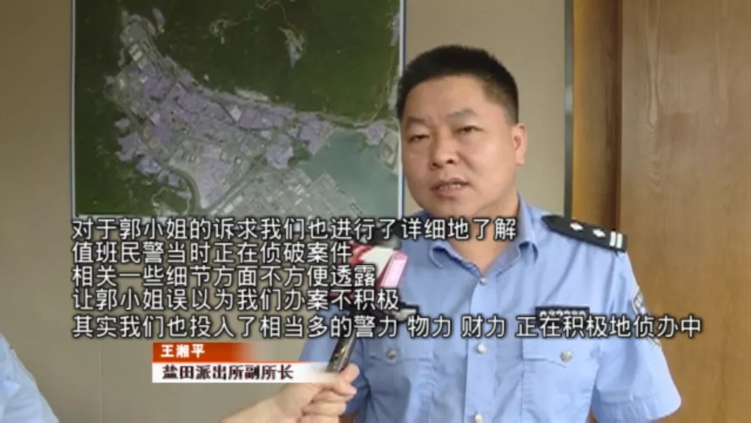 派出所表示,案件正在偵查當中記者也和郭女士來到鹽田派出所,由于負責此案的蔡警官正值休假,派出所的一位值班領(lǐng)導(dǎo),對郭女士當時所遭遇的處境,進行了情況說明。