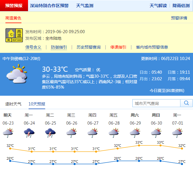 深圳新聞網(wǎng)2019年6月22日訊 受副熱帶高壓的影響,近幾日深圳氣溫持續(xù)上升,昨日(夏至)白天最高氣溫32℃~34℃,中北部及人口密集區(qū)最高氣溫達(dá)到35℃以上,全市高溫黃色預(yù)警生效中。周末恰逢中考到來(6月22日至24日),預(yù)計(jì)22日天氣炎熱到酷熱,中北部及人口密集區(qū)最高氣溫可達(dá)35℃或以上,提醒考生家長出門做好防暑降溫措施。
