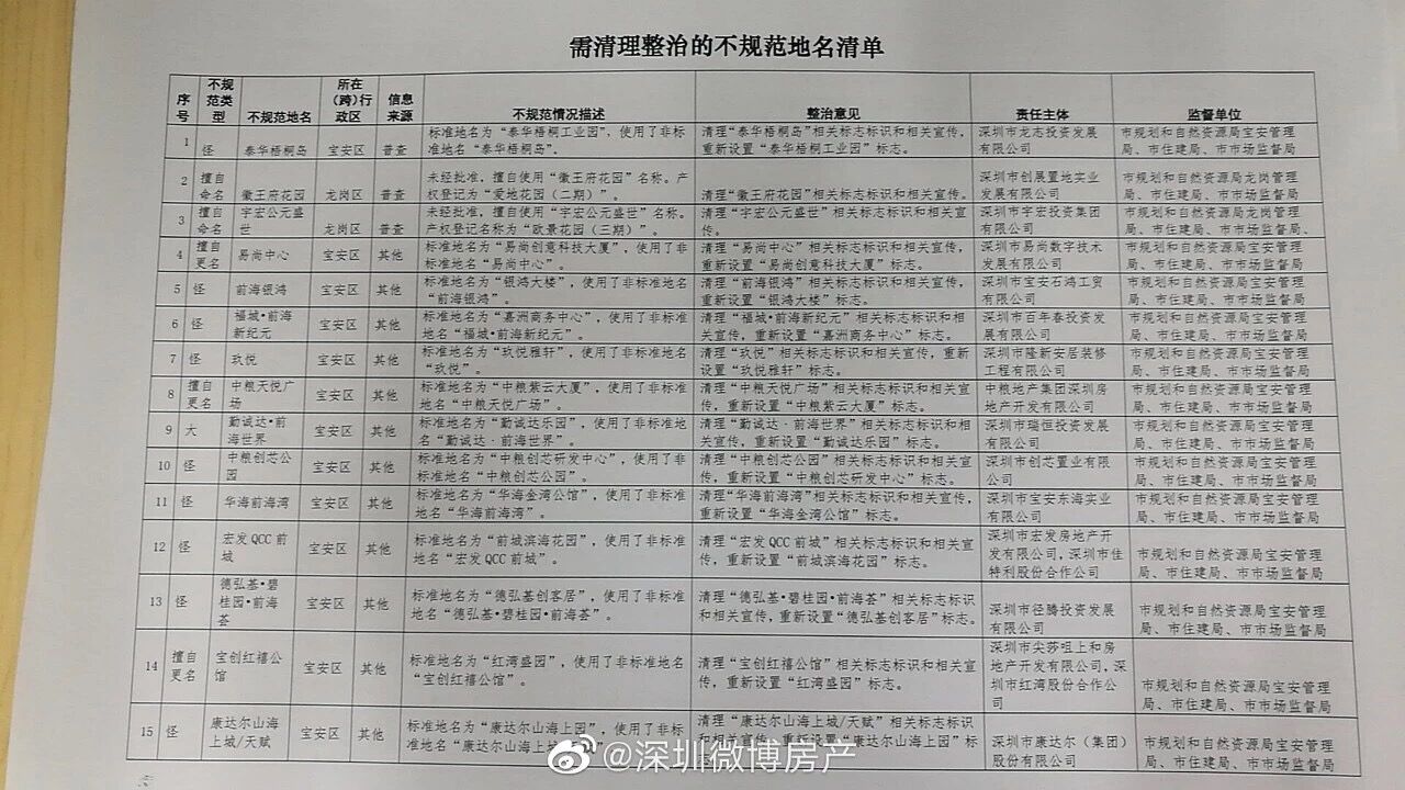 6月22日,深圳出爐了首批需清理整治的名單,涉及62個樓盤。記者從市規(guī)劃和自然資源局獲悉,深圳本次整治的重點為預(yù)售樓盤不規(guī)范地名使用和道路名稱不規(guī)范等問題,使用時間較長、社會和群眾認(rèn)可度較高的地名原則上不納入整治范圍。此外,整治原則上不涉及不動產(chǎn)權(quán)證、戶口本、身份證等相關(guān)證照的變更。