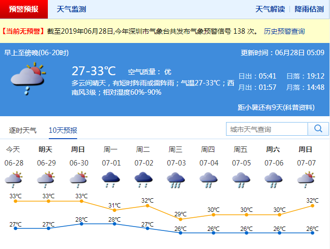 深圳今日天氣炎熱最高溫達33℃ 但7月1-2日陣雨增多