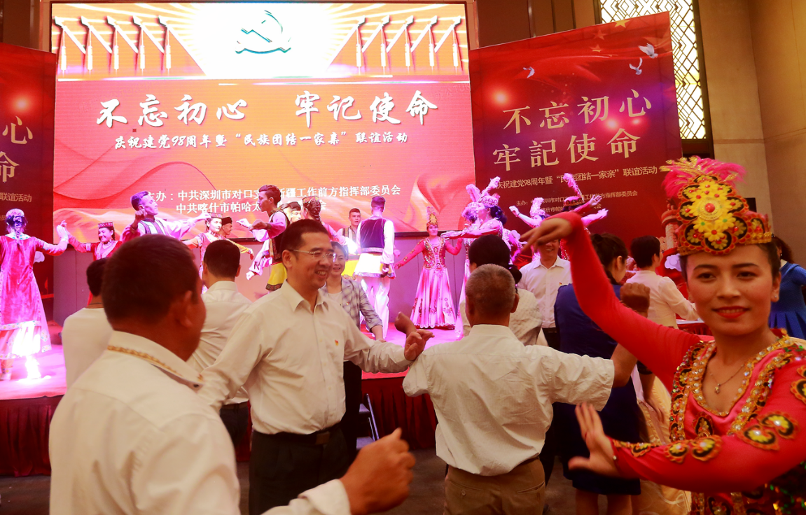 深圳新聞網(wǎng)2019年7月1日訊 盛夏七月,紅色黨旗迎風飄,為積極響應黨中央關(guān)于在全黨開展“不忘初心牢記使命”主題教育的重大部署。6月30日,深圳援疆前方指揮部、中共喀什市帕哈太克里鄉(xiāng)委員會聯(lián)合組織開展慶祝建黨98周年暨“民族團結(jié)一家親聯(lián)誼”活動。喀什地區(qū)行署領(lǐng)導、全體援疆干部人才、帕哈太克里鄉(xiāng)結(jié)親群眾等300余人參與活動。