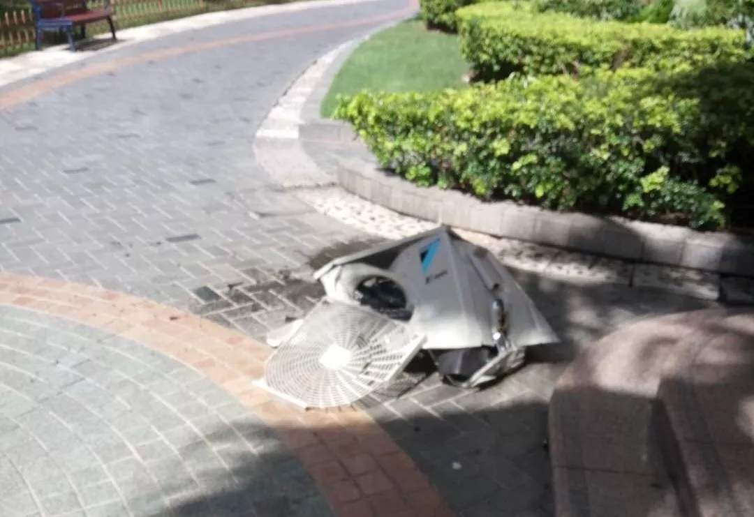 深廣電第一現(xiàn)場(chǎng)2019年7月1日訊 今天下午,福田區(qū)萬(wàn)科金色家園小區(qū)一臺(tái)空調(diào)主機(jī)從11樓墜下!巨大的聲音把業(yè)主嚇得不輕!?。?/span>空調(diào)外機(jī)應(yīng)該是固定好的怎么就會(huì)掉下來(lái)了?