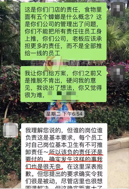 康先生拍了現(xiàn)場的照片,因為隔著杯蓋,可以看到有多個小黑點,但很難一眼辨認出是小蟑螂。不過,從康先生提供的微信聊天記錄可以看出,店方承認他們員工有疏忽,也派負責人跟康先生溝通賠償問題??迪壬硎镜昙以敢赓r償1000元,但他感覺對自己的精神影響很大,并不同意。