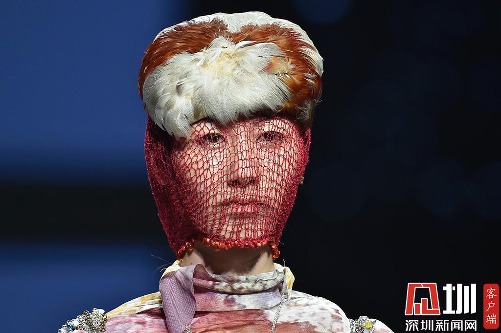 時(shí)裝優(yōu)秀學(xué)生組展示環(huán)節(jié),一位模特以獨(dú)特的造型亮相