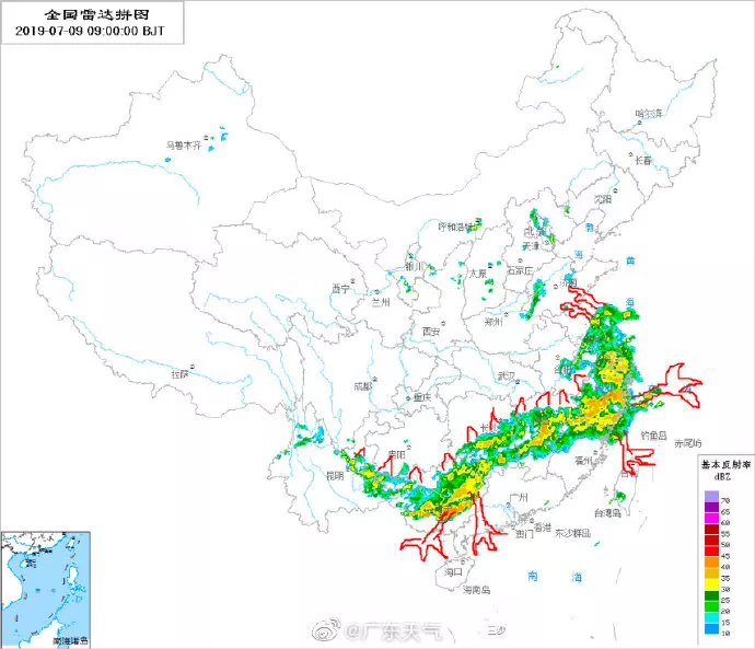 從今天早晨的雷達(dá)圖可見,廣東周邊省份已被狹長的降雨云帶控制,降水相當(dāng)激烈。另外,珠三角西側(cè)也有雷雨云團(tuán)生成。