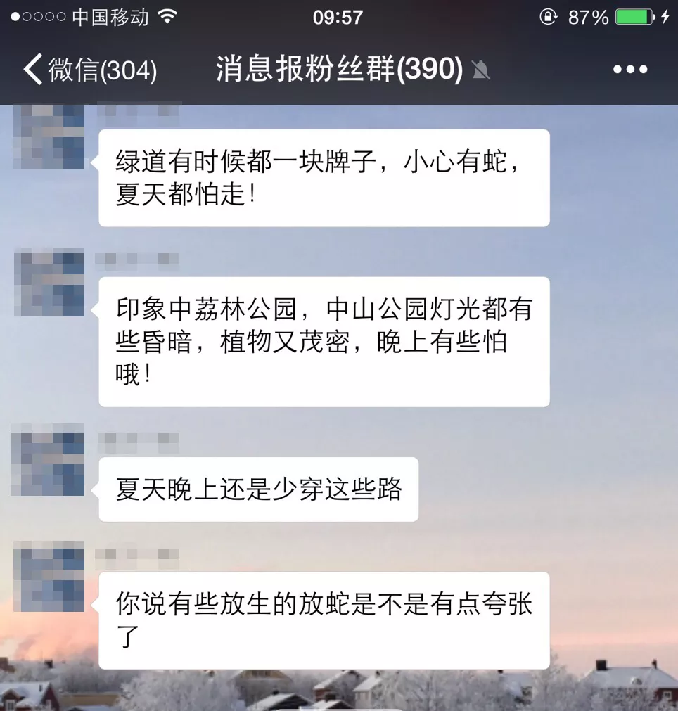 荔林公園蛇出沒的消息,在蛇口消息報(bào)微信粉絲群里炸開了鍋,有網(wǎng)友表示,此現(xiàn)象甚是危險(xiǎn),希望能加強(qiáng)管理。