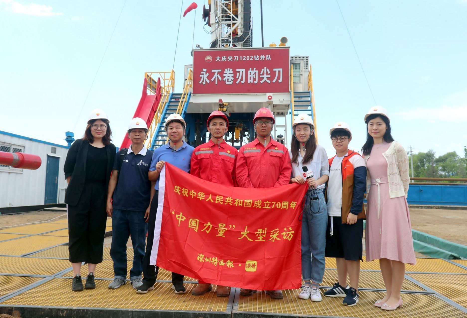 采訪組一行在1202尖刀隊(duì)鉆井臺(tái)現(xiàn)場(chǎng)采訪。